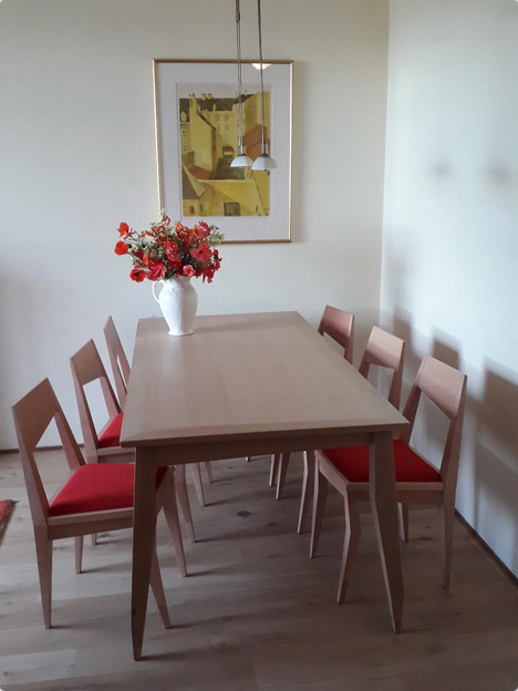 De tafel wordt geflankeerd door een zestal rood gestoffeerde beukenhouten stoelen. Deze stoelen zijn van het originele model, ‘BÝK’.