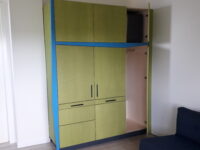 Ruime wasmachinekast in de kleur groen en blauw.